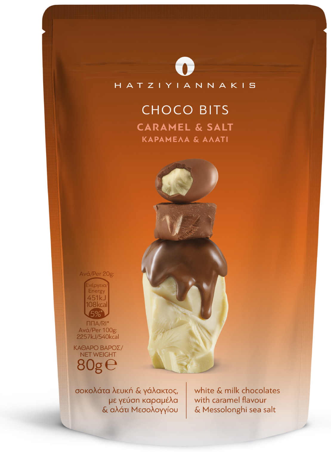 Μία πλούσια σοκολάτα γάλακτος κρύβει έναν απρόσμενο συνδυασμό. Λευκή σοκολάτα με γεύση από καραμέλα, παρέα με το εκρηκτικό αλάτι Μεσολογγίου.